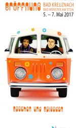 5. Mai: Der rheinland-pfälzische Kultursommer wird mit einem dreitägigen Fest in Bad Kreuznach eröffnet: Unter der Motto „Epochen und Episoden“ gibt es Musik, Theater, Kunst und Angebote für Kindern in den beiden Kurpark und an weiteren Veranstaltungsstätten. Ein originelles Plakat: Jimi Hendrix und Martin Luther sitzen gemeinsam in einem VW-Bully als Werbeträger für zwei Jubiläen: 500 Jahre Reformation und 50 Jahre „Sommer of Love“, der Hippiebewegung in Kalifornien.