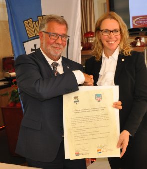 26. September: Seit 25 Jahren sind Bad Kreuznach und Neuruppin freundschaftlich miteinander verbunden. Zum Jubiläum wurde die Städtepartnerschaft in einem Festakt im Sympathie Hotel Fürstenhof feierlich erneuert. Bad Kreuznachs Oberbürgermeisterin Dr. Heike Kaster-Meurer und Neuruppins Bürgermeister Jens-Peter Golde unterzeichneten die Urkunde, auf der die Ziele der Städtepartnerschaft dokumentiert sind: die wechselseitigen Beziehungen auf allen gesellschaftlichen Ebenen zu erhalten und zu vertiefen, den Austausch zu stärken und voneinander zu lernen, neue Impulse für die Partnerschaft zu gewinnen, Ideen für gemeinsame Projekte zu entwickeln sowie mit vereinten Kräften zur Völkerverständigung in Europa beizutragen.