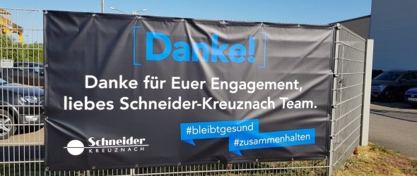 Die Einschränkungen zum Schutz vor dem Corona-Virus ist auch für die Menschen in Handel, Gewerbe, Dienstleistung und Industrie eine große Belastung. Hier zwei Beispiele, wie sich Unternehmen bei ihren Mitarbeiterinnen und Mitarbeitern bedanken. So hat Schneider Kreuznach Banner auf dem Werksgelände anbringen lassen. Die Firma Michelin gibt "Ihrer Familie oder guten Freunden" die Gelegenheit "beispielsweise unseren MICHELIN CrossClimate+ für ganzjährig sorgloses Fahren zu sichern. Je Gutscheincode erhalten Sie oder Ihre Liebsten auf bis zu vier beliebige MICHELIN PKW-Reifen", heißt es in einer Firmenmitteilung.