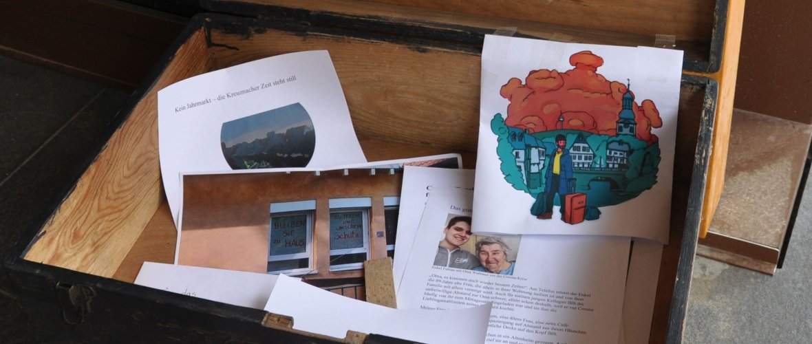 Unser Corona-Koffer vor dem Eingang zum Haus der Stadtgeschichte ist Blickfang vieler Passanten. Seit April 2020 sammeln wir Eindrücke, Erfahrungen und Erlebnisse in Zeiten der Corona-Krise in unserer Stadt und bewahren diese Dokumente für die Nachwelt auf. Uns haben mittlerweile viele Zusendungen erreicht, von denen wir eine Reihe in dieser Rubrik veröffentlichen. Weitere Fotos, Berichte und andere Dokumente nehmen wir weiterhin entgegen unter stadtarchiv@bad-kreuznach.de Sie dürfen auch gerne Ihre Materialien in unseren Corona-Koffer legen.