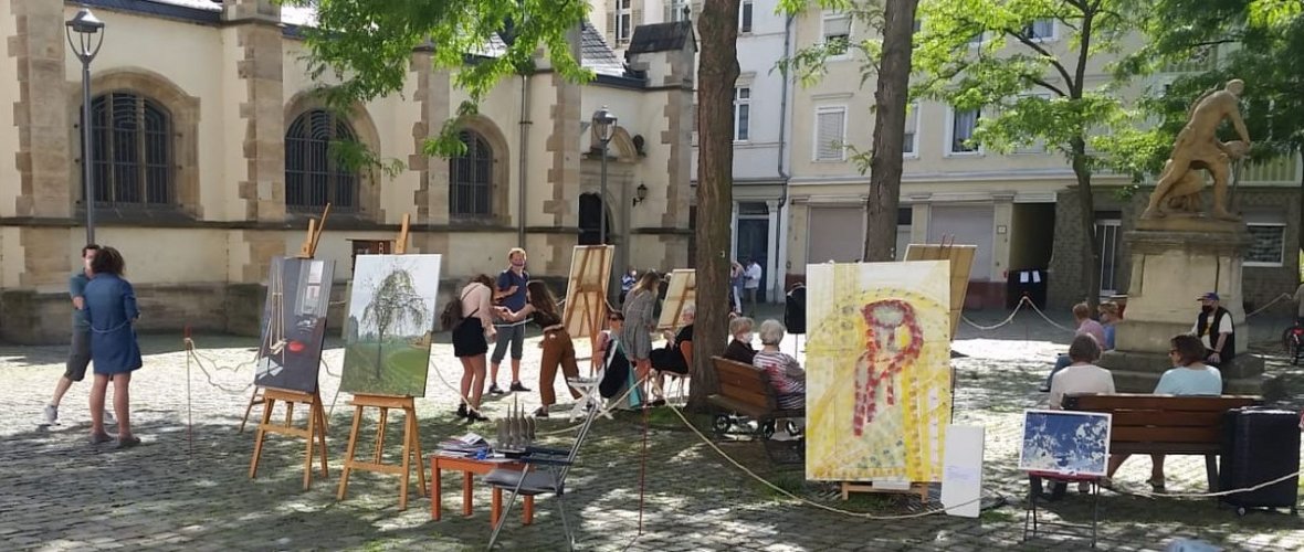 Wir lassen uns nicht unterkriegen. Wir ziehen an einem Strang. Corona zum Trotz belebte die frisch gegründete Neustadt-Initiative „Fissematente“ den Eiermarkt. Rund um den Michel Mort formierte sich ein Mix aus Bildender Kunst, Kunsthandwerk; Darstellender Kunst, Kunst und Literatur. Die Besucherinnen und Besucher nahmen es dankbar und begeistert an. Daher erfüllen wir gerne die Bitte der Veranstalter und nehmen das zugemailte Foto in unseren „Corona-Koffer“ auf.
