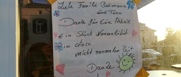 Den Helden der Corona-Zeit bringt die Bevölkerung viel Dank entgegen. Ein ensprechendes Plakat auf dem Schaufenster des Backhauses Baumann in der Manheimer Straße hat Sabine Friedrich fotografiert und uns die Aufnahme geschickt,