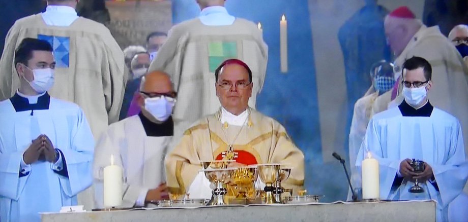 Bischof Meier beginnt mit der Eucharistiefeier. Statt „einander die Hand zu reichen“ bittet er die Gläubigen wegen Corona „Schenken wir einander freundliche Blicke als Zeichen von Frieden und Gemeinschaft.“ Es folgt die Verteilung der Hostien an die Gläubigen, die danach sofort wieder ihre Gesichtsmaske anlegen.