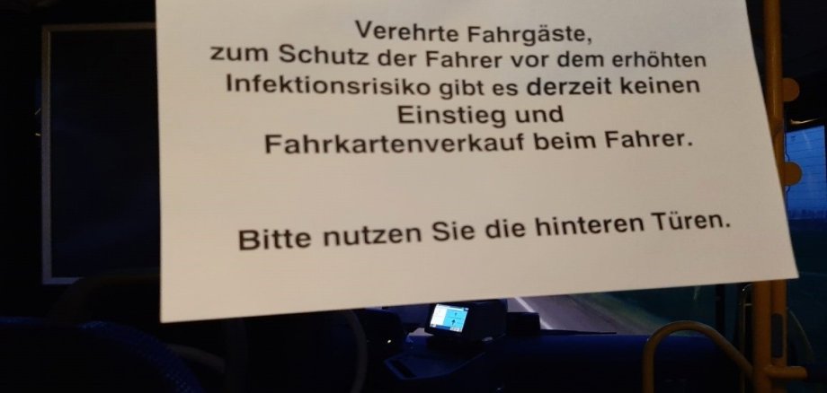 Am 13. März 2020 hingen an der Fahrertür der Deutschen Bahn Busse ein Schild mit der Aufschrift "Verehrte Fahrgäste, zum Schutz der Fahrer vor dem erhöhten Infektionsrisiko gibt es derzeit keinen Einstieg und Fahrkartenverkauf beim Fahrer. Bitte nutzen Sie die hinteren Türen."