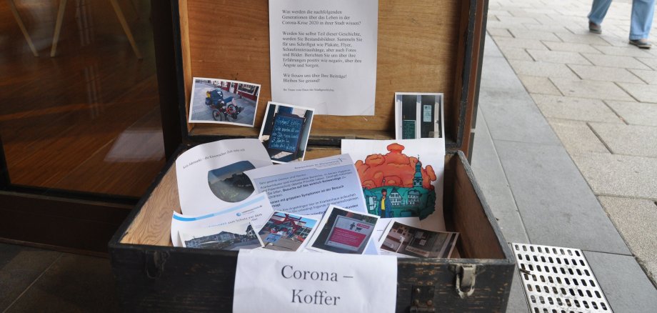 Der Corona-Koffer vor dem Haus der Stadtgeschichte findet bei Passanten große Beachtung