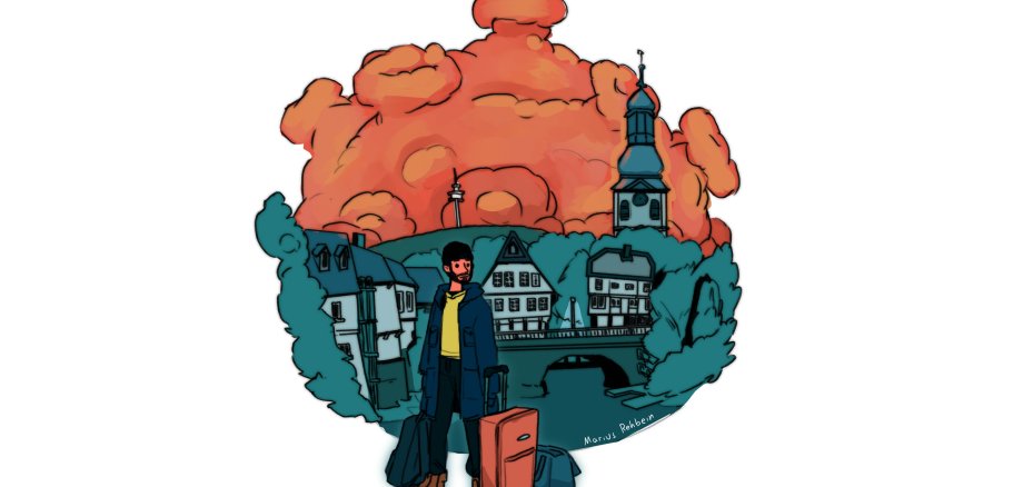 Rehbein, Student für Kommunikationsdesign in Mainz, hat ein Stimmungsbild von seiner Corona bedingten vorzeitigen Heimkehr von seinem Auslandsemester in Cardiff (Wales) gezeichnet: „Als ich mich auf das Wiedersehen mit meiner Heimat Bad Kreuznach freute, war mir noch nicht klar, dass die Heimreise doch schneller kommen sollte als gedacht. Am 11. März erklärt die WHO das Coronavirus zu einer Pandemie, am 12. März schließen in Frankreich und Portugal die Schulen, am 14. März erfahre ich, dass wohl auch an meiner Gasthochschule in Cardiff die Vorlesungen eingestellt werden, am 16. März sitze ich in einem Flugzeug von London Stansted nach Frankfurt am Main. Am Abend desselben Tages sehe ich aus dem Fenster des Autos wieder die ersten vertrauten Gebäude: Das Leuchtschild der Michelin über der B 41, den Fernsturm auf dem Schanzenkopf und natürlich die Weinberge. Von außen wirkt es so, als hätte sich Zuhause nichts verändert.