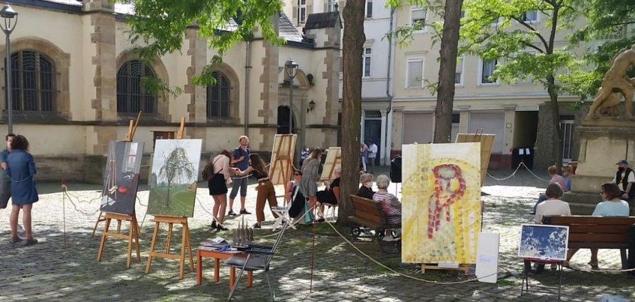 Wir lassen uns nicht unterkriegen. Wir ziehen an einem Strang. Corona zum Trotz belebte die frisch gegründete Neustadt-Initiative „Fissematente“ den Eiermarkt. Rund um den Michel Mort formierte sich ein Mix aus Bildender Kunst, Kunsthandwerk; Darstellender Kunst, Kunst und Literatur. Die Besucherinnen und Besucher nahmen es dankbar und begeistert an. Daher erfüllen wir gerne die Bitte der Veranstalter und nehmen das zugemailte Foto in unseren „Corona-Koffer“ auf.