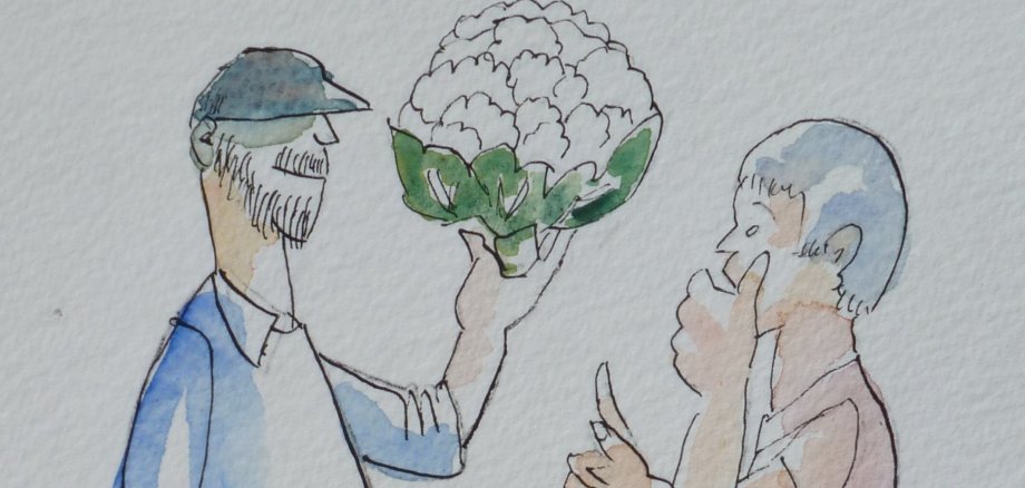 Ich starte mit dem Einkaufskorb am liebsten am Gemüsestand. Diesmal ist Blumenkohl dran. Blumenkohl gehört zu den gesündesten Gemüsearten. Mein ausgewählter Blumenkohlkopf ist zum Stückpreis von 4,99 € zu haben. Als ich nach Hause komme, schlägt meine Frau entsetzt die Hände über dem Kopf zusammen: „Vier Euro neunundneunzig!!!“. Sie gehört zu den kritischen Hausfrauen, die gerne mal zum Vergleich an die D-Mark-Zeiten erinnern. Damals bekochte sie einen Haushalt mit zwei Erwachsenen und vier Kindern, da war Wirtschaftlichkeit angesagt. „Da hätte ich ja damals für den Blumenkohl zehn Mark hinlegen müssen“, stellt sie fest. Ich weise darauf hin, dass die Landwirtschaft in der Corona-Krise enorm unter Kostenstress steht. Außerdem ist bekannt, dass der Blumenkohl schon immer teuer ist, weil die Landwirte in Handarbeit die Deckblätter über das Innere knicken, damit die von Natur aus elfenbeinfarbenen Blumenkohlröschen auf Wunsch der Hausfrauen schön weiß bleiben.