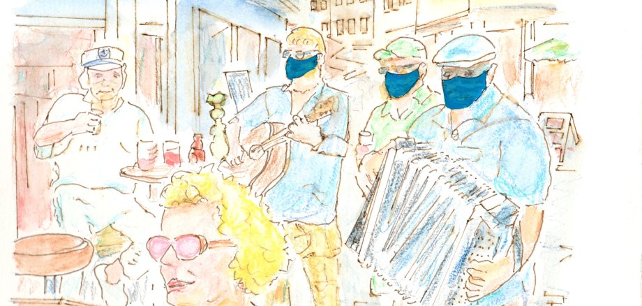 Musiker müssen keine Mundschutzmaske tragen. Es kehrt wieder mehr Normalität in das öffentliche Leben zurück. Hoffentlich bleibt dies auch so. Zeichnung: Bertold Schwartz-Crato