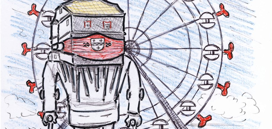 Wie traurig die Corona-Zeiten sind, hat Peter Trautmann für das Corona-Tagebuch im Haus der Stadtgeschichte gemalt. Motiv ist das Brückenhaus, „das sowieso schon genug gebeutelt ist mit seinen kranken, lahmen und mittlerweile gebrechlichen Füßen. Jetzt muss es auch noch eine Maske tragen und zum schlimmsten kommt es aus dem Hintergrund, unser geliebter Kreuznacher Jahrmarkt fällt der Corona Pandemie auch noch zum Opfer, also: NIX WIE CORONA! Sehr schade für uns alle.“