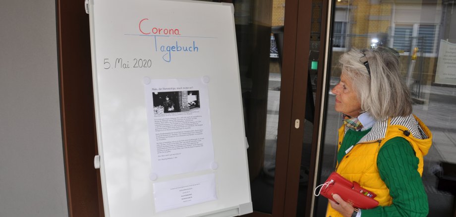 Foto: Vor der Eingangstür informiert täglich eine Schautafel über den aktuellen Eintrag im Corona-Tagebuch