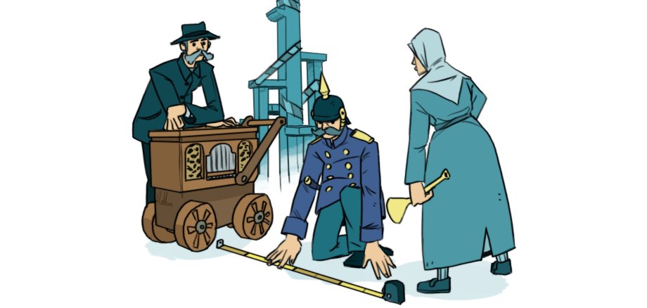 Über all dem Treiben wachen, von der Krise ungerührt, die Kreuznacher Stadtoriginale auf ihrem Brunnen. Die Abstandsregeln einzuhalten ist schwer, vor allem wenn man aus Bronze gegossen ist. Der pflichtbewusste Schutzmann Wiechert würde, wenn er von seinem Sockel herabsteigen könnte, streng auf die Einhaltung der Regeln achten. Wiechert, der ja bekanntlich schon seinerzeit bei den zänkischen Marktbesuchern gefürchtet war, würde bestimmt auch keine Ausnahme für seine gegossenen Kumpane auf dem Brunnen machen. Da müssten auch der Debbedee, Gänzjie und Co ihre Plätze räumen und sich mit 1,50 m Abstand voneinander um den Brunnen aufstellen. Ob vor Marris Feierbloos auch einen Spuckschutz installiert werden sollte, müsste dann wohl noch im Einzelnen ausdiskutiert werden.