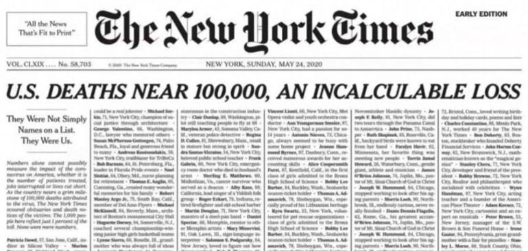 Foto: Auch eine Form des Protestes. Die New York Times veröffentliche in ihrer Ausgabe vom 24. Mai die Namen von 1000 Corona-Toten. Die Gesamtzahl der Pandemie-Opfer ist in den USA auf über 100.000 angestiegen. Quelle: ZDF
