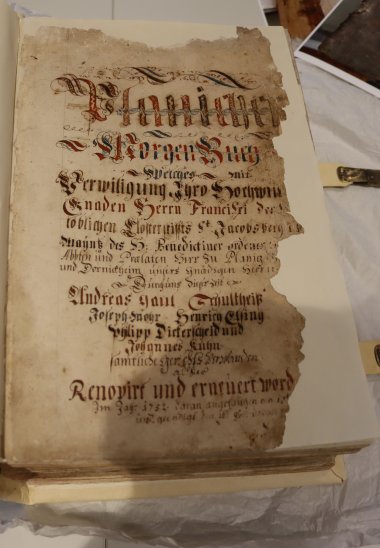 Im Morgenbuch ist der Besitz an Haus, Hof, Garten, Acker, Wiesen und Weingärten der Einwohner Planigs erfasst und das auf 944 Seiten. Die kunstvoll gestaltete Titelseite informiert darüber, dass das Morgenbuch im Jahr 1752 erneuert wurde. Namentlich sind Andreas Gaul (Schultheiß), Joseph Mohr, Henrich Elsing, Phlipp Dickerscheid und Johannes Kühn aufgeführt. Planig gehörte zu jener Zeit zum Besitz des „Löblichen Klosterstifts S. Jacobsberg, dem „Ihro Hochwürdigen Gnaden Herrn Francisci“ vorstand.