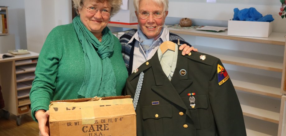 Heidrun Gut aus Bad Münster hatte einen alten und leeren Karton mitgebracht, ein legendäres Care-Paket, das US-Bürger nach dem Zweiten Weltkrieg an die Deutschen verschickte. „Ich schmecke noch die Trockenmilch und den salzigen Käse“, erinnert sich Rosemarie Schitteck an den leckeren Inhalt. Sie hat noch einen weiteren Grund für Ihre Dankbarkeit. „Die Amerikaner haben mir Lagerräume für meine Kleiderspenden für Rumänien zur Verfügung gestellt und tonnenweise Süßigkeiten für die Kinderheime gespendet.“ Das Verhältnis war so herzlich, dass sie zum Abschied der 1. Panzerdivision eine Militäruniform geschenkt bekommen und sie zum Gespräch ins Stadtarchiv mitgebracht hat.
