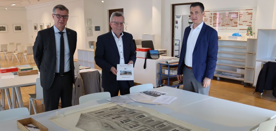 Foto: Gemeinsam mit Landgerichtspräsident Thomas Bergmann (links) besuchte Gerhard Schwanke (Mitte) das Haus der Stadtgeschichte und übereichte Oberbürgermeister Emanuel Letz sein Buch über die Geschichte der Gerichtstandorte in Bad Kreuznach. Auf dem Tisch liegt ein Plan mit der Frontansicht des Casinogebäudes, von 1950 bis 1956 Sitz des Landgerichtes.