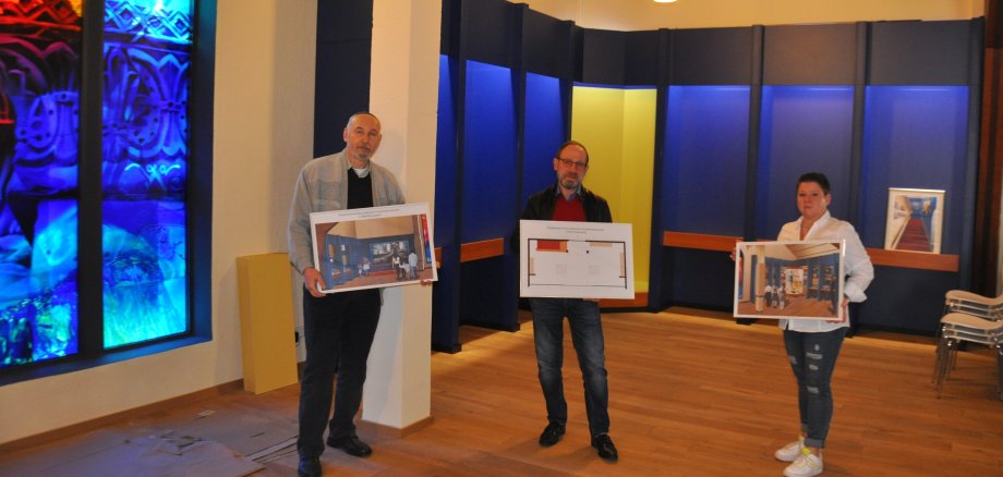 Foto: Valeryan Ryvlin (mitte) präsentiert gemeinsam mit Gemeindesekretärin Nicole Völker und dem Gemeindemitglied Valeriy Shtrom (Designer) die Pläne für die Dauerausstellung auf der Empore der Synagoge. Die ersten Vitrinen sollen im Sommer bestückt werden.