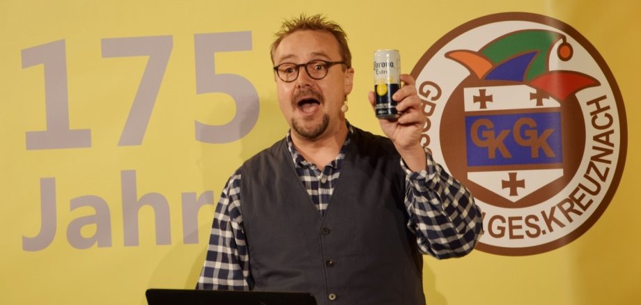 Foto: Mit einer "Corona(Bier-)-Impfdose" schützt sich Jochen Merz vor Corona. Der Fastnachter von den "Hargesheimer Dippeschisser" war Gastredner bei der Online-Sitzung der Großen Karnevalgesellschaft "Fassenacht&Wein@Home).