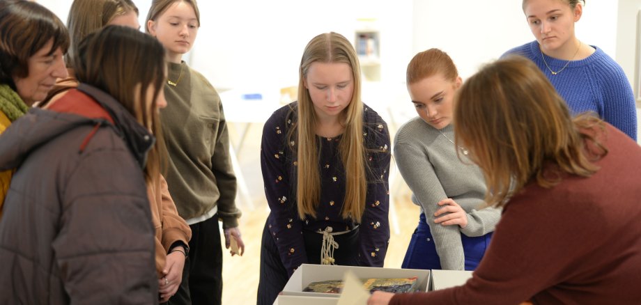 Die Schüler*innen-Gruppe des Generationen-Projekts unter der Leitung von Christiane Kasper, Studiendirektorin i. P., berichtet von ihrer Arbeit mit der vom Haus der Stadtgeschichte konzipierten Archiv-Box zur Biographie der jüdischen Journalistin Margot-Pottlitzer-Strauß aus Bad Kreuznach (siehe Foto).
