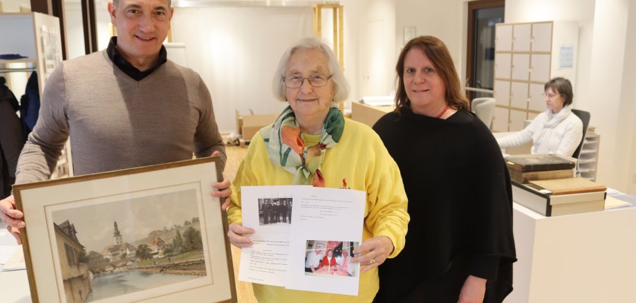 Foto: Das Gemälde mit der Brückenhausansicht kommt in das Dienstzimmer des Oberbürgermeisters. Emanuel Letz bedankte sich bei Gisela Wohlleben für die Schenkung. Rechts Stadtarchivarin Franziska Blum-Gabelmann.