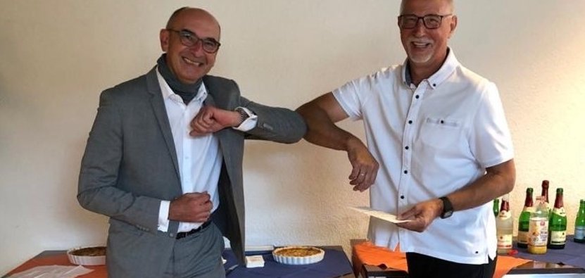 Foto: Corona-Ellenbogen-Gruß. Odo Steinmann, Vorstand Volksbank Rhein-Nahe-Hunsrück und Gisbert Wolnizki (Filialleiter Simmern), der in den Ruhestand verabschiedet wurde. Foto: Volksbank