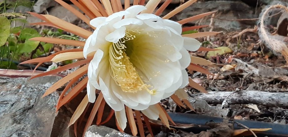 Der Ratschlag sich über die kleinen Dinge des Lebens zu freuen, hat ein ganz anderes Gewicht als vor der Pandemie, zu der Zeit, in der wir noch unbeschwert, ohne Angst und maskenfrei mit vielen Menschen feiern konnten. Daher habe ich mich sehr über das Foto gefreut, das mir eine gute Freundin aus Spanien, Eva Bock-Meyer, geschickt hat. Sie hatte das seltene Vergnügen, das Aufblühen der Königin der Nacht zu beobachten.