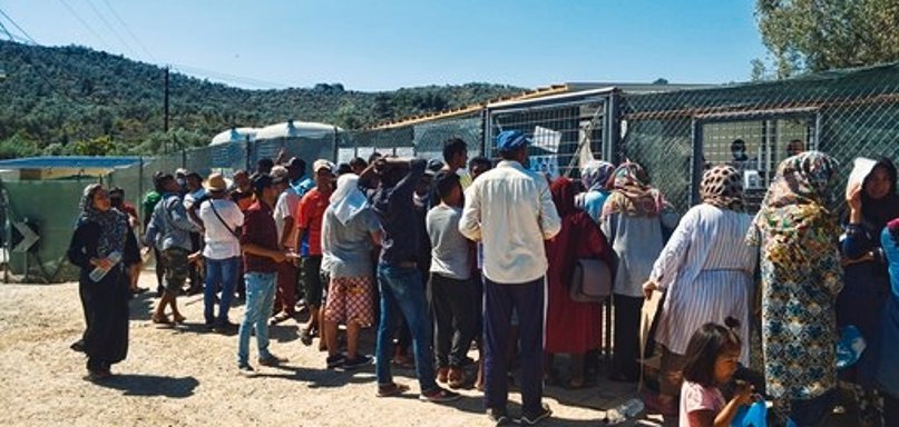 Foto oben: Großes Gedränge vor der Corona-Teststation im Flüchtlingslager Moira auf Lesbos. Fotos:. Marc Bremmer