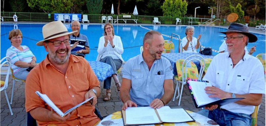 Foto: Markus Bach (links) bei der "Männerlesung" im Freibad Bad Münster.
