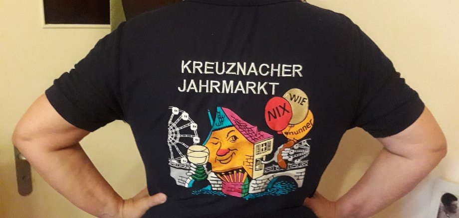 Ich werde dort auch meine Arbeitskleidung tragen, das blaue Polo-Shirt mit dem lustigen Brückenhaus, das ich für die Betreuung der Naheweinprobe auf dem Riesenrad bestellt habe.