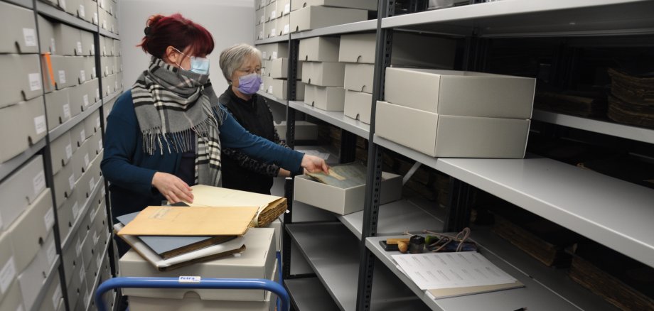Foto: Sarah Förster (li.) und Anne Wohlleben räumen die Akten wieder in die Regale