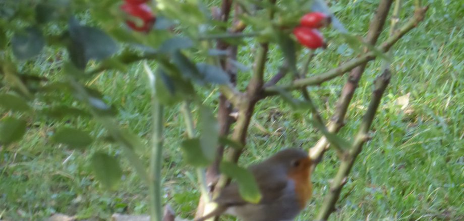 Kürzlich entdeckte ich, wie sich eines unser beiden Rotkehlchen vor einer Hagebutte auf einen Stein gesetzt hatte. Ich holte meine Kamera, aber flink, wie diese Vögelchen nun einmal sind, war mein Modell inzwischen weggeflogen.