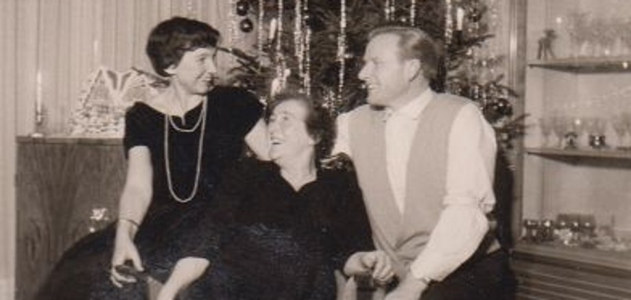 Der Weihnachtsbaum vor dem die Anwesenden posieren mit Lametta, Weihnachtskugeln und Kerzen geschmückt – auf einem Beistelltischchen ein üppig dekoriertes Lebkuchenhaus – gediegener Wohlstand – glückliche Menschen – Weihnachten eben!