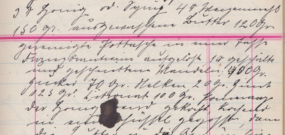 3 Pfd. Honig od. Syrup, 4 Pfd. Weizenmehl, 150 g ausgewaschene Butter, 120 g gereinigte Pottasche in einer Tasse Franzöischer Branntwein aufgelöst ein Pfund geschälte und geschnittene Mandeln, 400 g Zucker, 70 g Nelken, 20 g Zimt, 125 g Zitronat, 100 g Pomeranzen. Der Honig wird gekocht, kochend in eine Schüssel gegossen, dann die Butter u. die Gewürze hinzugeben, zuletzt das Mehl, dann wird der Teig auf einem Brett festgeknetet, dann läßt man den Teig warm zugedeckt im warmen Zimmer 8-10 Tage stehen, rollt und sticht ihn aus.
