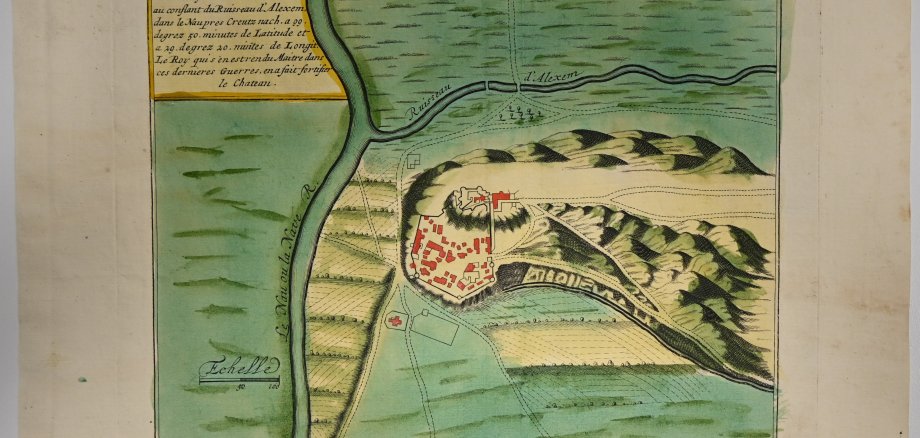 Einer der Kupferstiche der Burg von Nicoals de Fer (1646-1720), dem offiziellen Kartographen Ludwigs XIV wurde in seinem Atlas: L'Introduction a la Fortification où Les forces de l'Europe erstmals 1690 veröffentlicht. Das Werk umfasst technische Berechnungen, Pläne von Festungen (sowohl theoretische als auch reale), befestigte Städte sowie Ansichten und Karten der Umgebung. Der kolorierte Plan Nr. 1 (Foto oben) stammt aus der holländischen Fassung von de Fers Festungsatlas, die parallel zur französischen im Jahre 1696 von Pieter Mortier (1661-1711) herausgegeben wurde. Plan Nr. 2 wurde durch Buchändler und Verleger Pieter van der Aa für sein, im Jahre 1729 erschienene Werk: La Galerie agréable du monde von de Fers Vorlage im wahrsten Sinne „abgekupfert“.