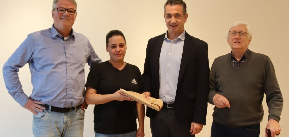 Foto: Der Erlebnisbericht ihres Urgroßvaters Matthäus Wahl übergab Yvonne Etscheid an Oberbürgermeister Emanuel Letz im Beisein von Joachim Rehbein (rechts) und Hansjörg Rehbein. Foto: Sarah Förster