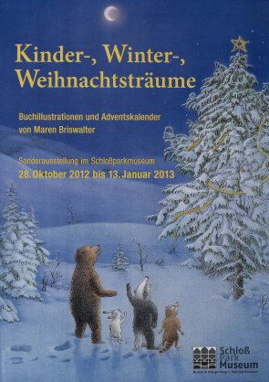 Das Bild hinter dem ersten Türchen zeigt eines der Ausstellungsplakate des Schlossparkmuseums, seit 2017 Museum Schlosspark, die das Haus der Stadtgeschichte archiviert. Beworben wurde die Sonderausstellung „Kinder-, Winter-, Weihnachtsträume. Buchillustrationen und Adventskalender von Maren Briswalter“. Sie war von Ende Oktober 2012 bis Mitte Januar 2013 zu sehen. Sie zeigte eine Auswahl von Originalillustrationen für Kinderbücher, u. a. für Schneehäschens Stern, Schneehäschens Weihnachtsüberraschung, Holly und Ivy, Nußknacker und Mäusekönig, Nathan der Weise und Das kalte Herz sowie Adventskalender. Parallel dazu wurden im benachbarten Museum für PuppentheaterKultur Illustrationen von Maren Briswalter zum Kinderbuch Pole Poppenspäler gezeigt.
