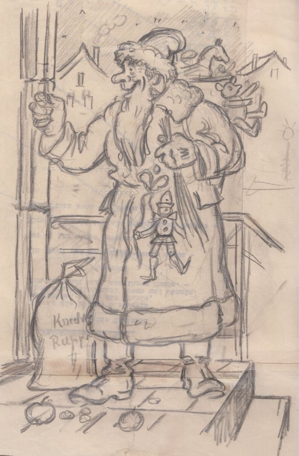 Mit seinen Werbezeichnungen, Grafiken, Kinoreklamen, Dekorationsentwürfen, Karikaturen, illustrierten Geschichtchen, Gemälden und Postkarten hatte sich Jacob Thon nach dem Konkurs seiner Getreidegroßhandlung 1923 und dem darauffolgenden Aufbau eines Reklame-Ateliers schnell einen Namen gemacht. In seinem Nachlass finden sich daher einige Zeichnungen und Werbeentwürfe für Anzeigen zur Adventszeit. Hervor stechen darunter Bleistiftzeichnungen, die durchaus mit humoristischem Anklang Brauchtum, Ereignisse und Alltagsgeschehen in der Vorweihnachtszeit aufgreifen – wie der hier vorgestellte Weihnachtsbaumverkauf. (Franziska Blum-Gabelmann)