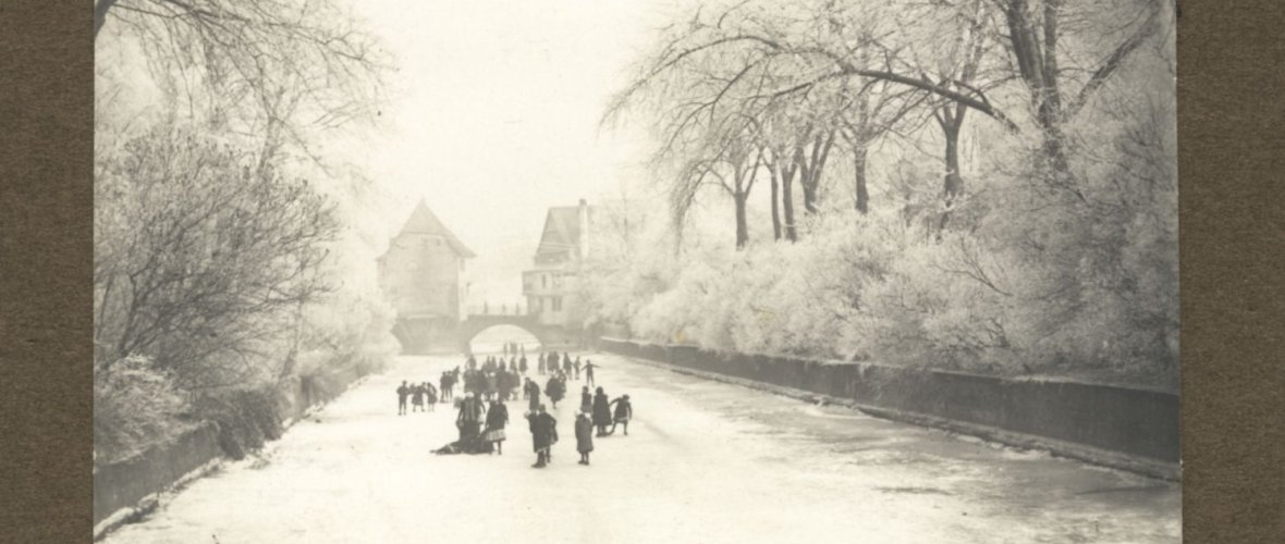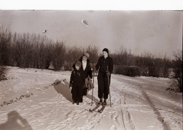 Skifahren als beliebter Freizeitsport, so zeigt ein Bild aus dem Nachlass Gravius einen Familienspaziergang im Schnee mit Skiern.