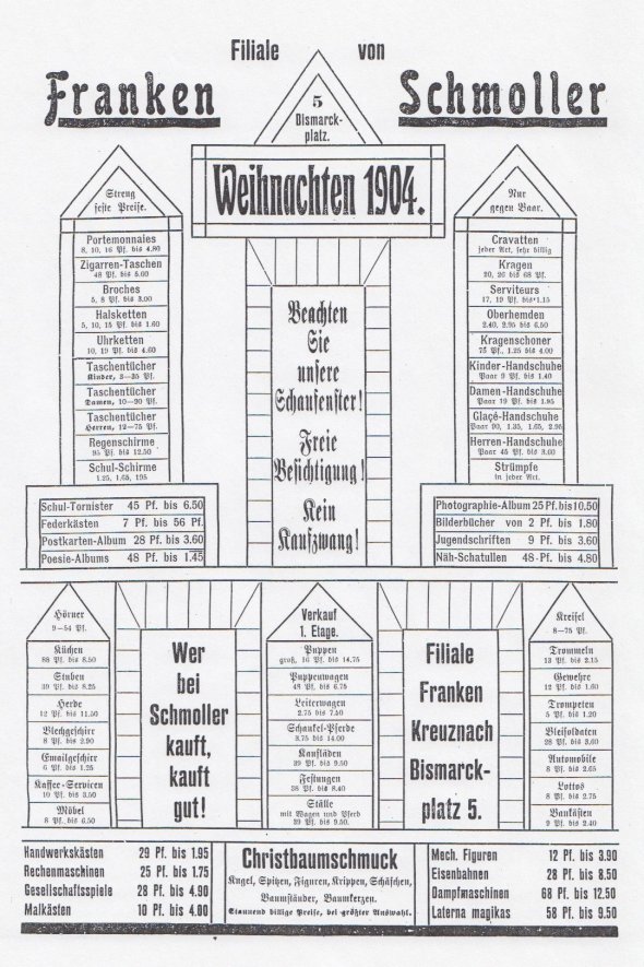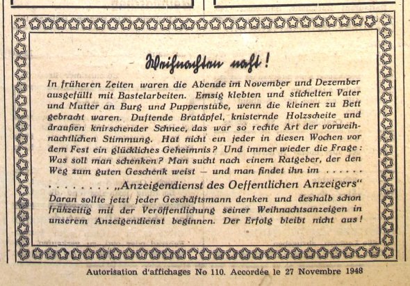 „Weihnachten naht!“ Daß diese Mahnung in deutscher Schreibschrift gesetzt ist, verweist das Inserat schon auf den ersten Blick in eine etwas fernere Vergangenheit. Die französischsprachige Fußzeile erlaubt die nähere Einordnung.
