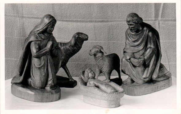 Im Nachlass des aus Österreich stammenden und seit 1897 in Kreuznach ansässigen Holzbildhauers Franz Ignaz Vacek (1874-1953) befinden sich Fotopostkarten von seinen Werken. Sie dienten ihm in erster Linie zu Werbezwecken. Darunter eine Aufnahme, die eine Krippenszenerie andeutet. Um das in einer Futterkrippe liegende Kind, es trägt einen Heiligenschein, knien betend ein Mann und eine Frau. Im Hintergrund der Personengruppe stehen zwei Schafe. Die Verbindung mit dem Christuskind definiert die Figuren als Maria und Josef. Von ihnen existieren weitere Fotopostkarten, die das Augenmerk des Betrachters auf die gesamte Ausführung lenken und besonders die Gesichtszüge der kleinen Skulpturen detailliert zeigen. Diese waren so angelegt, dass jede Figur für sich, ohne Bezug zur Krippe, auch als Andachtsfigur Verwendung finden konnte.