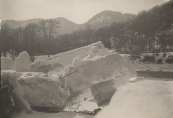Am Ufer der Nahe – vermutlich im Salinental in Bad Kreuznach um 1930 – ziemlich direkt vor dem*der Fotograf*in hat sich eine dick mit Schnee bedeckte, transparente Eisscholle über einen anderen Eisbrocken und abgestorbene, kärgliche winterliche Pflanzenreste geschoben. Sie ragt nun vor der bewaldeten, aber kahlen, anderen, hügeligen, verschneiten Uferseite nach oben. In ihr steckt der ein oder andere abgeknickte dünne Ast. Von außerhalb des Bildausschnitts scheint fahle Wintersonne von oben auf das Motiv.