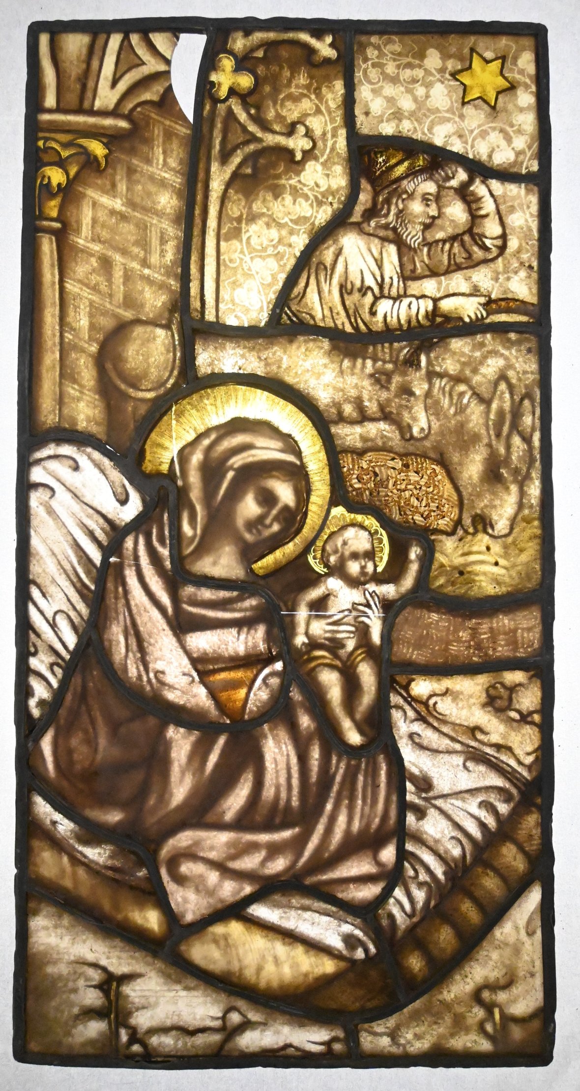 Das 44,2 x 22,5 große Bleiglasfenster aus partiell Neuantikglas mit Schwarzlotbemalung und Schablonendruck ist eine Arbeit aus der ersten Hälfte des 20. Jahrhunderts. Künstlich aufgebrachte Alterungsspuren und die Stilistik des Motivs lassen es älter erscheinen als es ist. Trotz des Namens wird in Bleiglasfenstern kein Bleiglas verwendet.