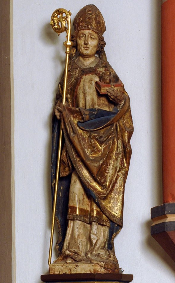 Dazu passt die polychrom gefasste gotische Holzfigur im Chor der Bad Kreuznacher Nikolauskirche. Sie zeigt Nikolaus als Bischof in Pontifikaltracht mit Mitra und Bischofsstab – eine Darstellung, die seit dem 13. Jahrhundert für den hl. Nikolaus üblich ist. Bei der hier vorgestellten Skulptur aus der Zeit um 1500 trägt Nikolaus die Bibel, auf welcher drei kleine, runde Brote liegen. Letztere verweisen auf eine der bekanntesten Nikolauslegenden – die der Hungersnot von Myra. Die Figur wurde 1925 in Mainz im Kunsthandel erworben. Formal entsprach sie dem vorgegebenen Konzept, St. Nikolaus im Zuge der Restaurierung einheitlich im gotischen bzw. neugotischen Stil auszustatten. 1927 wurde die Figur gestohlen, doch ein Jahr später reumütig vom Dieb wieder zurückgebracht.