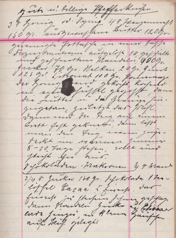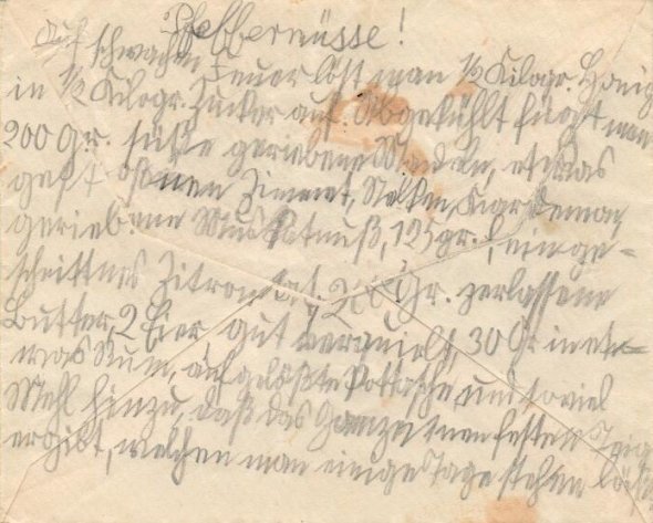Emmy Pottlitzer muss gerade kein anderes Papier zur Hand gehabt haben, als sie die Anleitung zur Zubereitung von Pfeffernüssen Anfang des 20. Jahrhunderts abschrieb oder man sie ihr diktierte. Notiert auf einem Briefumschlag mit Bleistift in hastiger, teils ausgebesserter Kurrentschrift lässt vermuten, dass sie das Rezept unbedingt haben wollte – wer weiß – das ist Spekulation. Doch finden sich in ihrem 16,8 x 10 cm großen Notizbuch in Kartonbindung vielerlei solcher handschriftlichen Rezepte, notiert auf Einzelseiten, eingelegten Zetteln und sogar auf einer Grußkarte. Dazu Vermerke von Ausgaben, Schnittmuster, Geburtstagslisten und Zeitungsauschnitte, die sie zwischen den Seiten ihres Notizbuchs aufbewahrte.