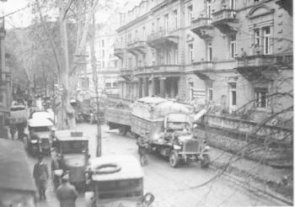 Foto: Eintreffen der Einquartierungskommission in Bad Kreuznach, 8. Dezember 1918. Im Hintergrund das Kurhaus, davor der Fürstenhof, der vom französischen Militär besetzt wurde [Bild: Stadtarchiv Bad Kreuznach, NL Gampper]