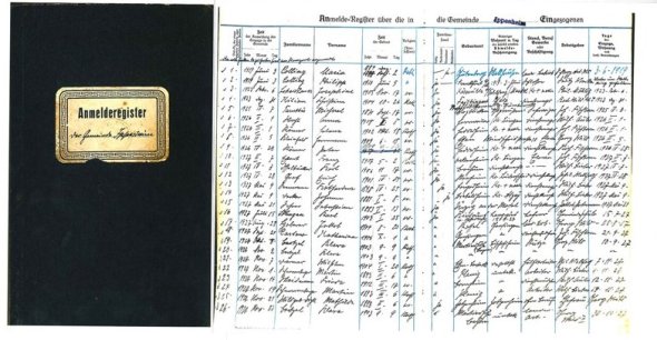 „Das Anmelderegister über die in die Gemeinde Ippesheim Eingezogenen“ wurde vom 3. Juni 1919 bis 30. Mai 1969 von der Ortsgemeinde Ippesheim geführt. Der erste Eintrag vom 3. Juni 1919 in das schwarz umschlagene und geheftete Buch bezieht sich auf den Zuzug der aus Gutenberg stammenden Maria Colling, der letzte vom 30. Mai 1969 auf Jutta L. aus Bingen.