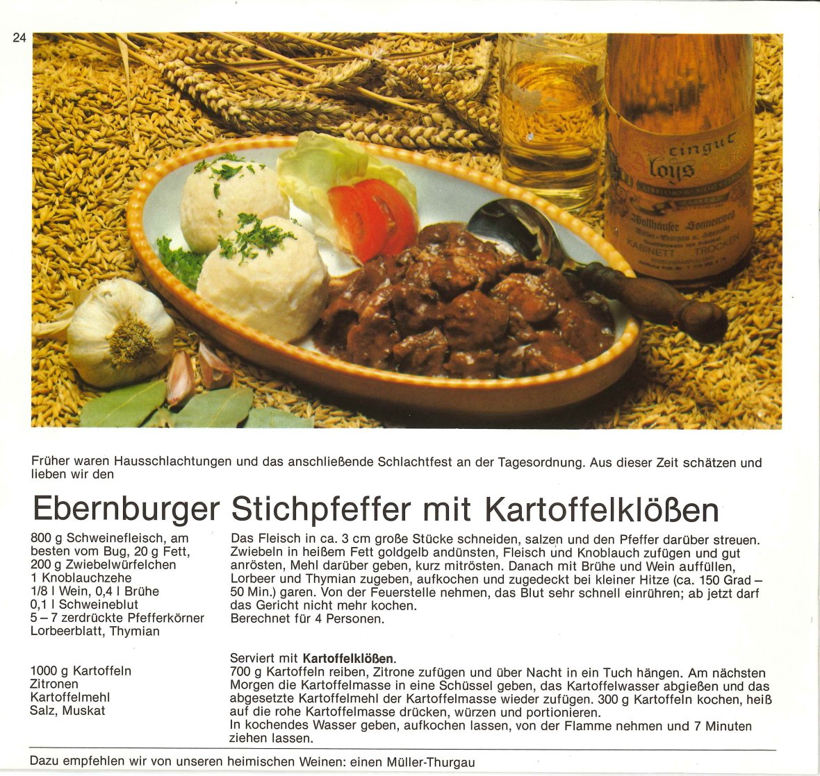 Das Rezept „Ebernburger Stichpfeffer mit Kartoffelklößen“ ist dem „Gaumenführer: Herzhaft-leckeres von Nahe und Hunsrück“ entnommen. Die Broschüre, die für das Naturparadies Nahe-Hunsrück warb, wurde um 1980 von dem Kreisverkehrsamt des Kreises Bad Kreuznach herausgegeben. „Zusammengetragen, probegekocht und vorgebruzzelt“ wurden die deftigen Gerichte „aus Omas Küche“ von dem Koch Hans-Jürgen Ziegler. Der damalige Landrat Hans Schumm (1927-2007) ermunterte den Leser in seinem Vorwort dazu, die Gerichte nachzukochen und – mit heimischem Bier und Wein zu genießen. In der Broschüre finden sich 25 Rezepte und Fotos von Gerichten aus der Region, darunter: „Kreuznacher Zwiwwelkuche“, „Kreuznacher Spansau (Original Zimmersches Rezept)“, „Ebernburger Stichpfeffer“ oder „Kirn-Sulzbacher Kartoffelklöße“. Ob es sich bei dem Spansaugericht, das für 20-25 Personen berechnet ist, tatsächlich um das Originalrezept des bekannten Bad Kreuznacher Gastronomen und Fastnachters Otto Zimmer (1896-1966) handelt, konnte nicht in Erfahrung gebracht werden. Dem „Ebernburger Stichpfeffer“ wird eine hohe Authentizität bei der Zutatenzusammensetzung zugesprochen. Ein traditionelles bäuerliches Gericht, das bei den früher durchaus üblichen Hausschlachtungen zubereitet wurde, da dann in einem Privathaushalt frisches Schweineblut verfügbar war. Doch nicht nur da, sondern auch in den Gasthöfen der Region war das Gericht zumeist im Herbst auf der Speisekarte zu finden. Vielleicht animiert das Rezept den einen oder anderen Leser dazu, sich auf eine geschmackliche Erinnerungsreise ins letzte Jahrhundert zu begeben. Die Rezeptsammlung dokumentiert Alltagskultur und ist ein Zeugnis der sich stetig verändernden Essgewohnheiten nicht zuletzt in einer Region. Die Broschüre ist Teil einer Materialsammlung, die sich mit dem Essen und Trinken in (Bad) Kreuznach beschäftigt.