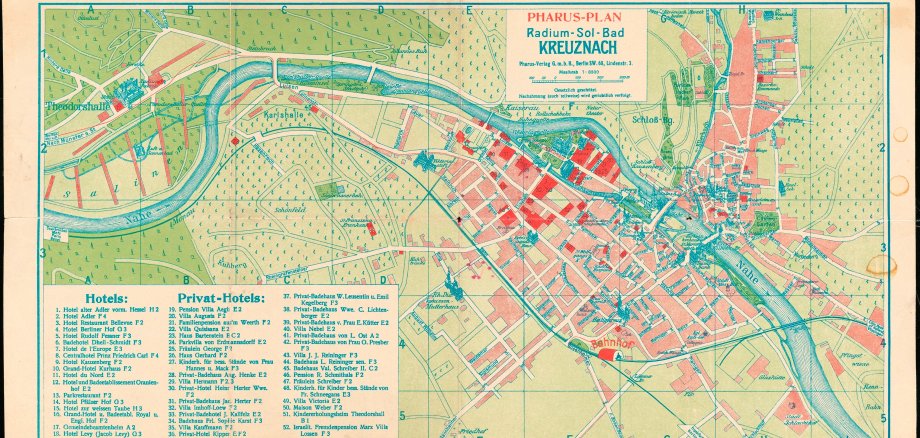 Der Pharus-Plan von Kreuznach wurde von dem in Berlin ansässigen Pharus-Verlag im Jahr 1912 herausgegeben. Das 1902 gegründete Unternehmen hatte sich von Beginn an auf zweckmäßige, klar strukturierte und übersichtliche Stadtpläne spezialisiert. Das Markenzeichen der Pläne waren perspektivische Zeichnungen, die aus den farbig gedruckten Karten realitätsnah hervortraten und das Augenmerk des Betrachters auf besondere Gebäude lenkten.