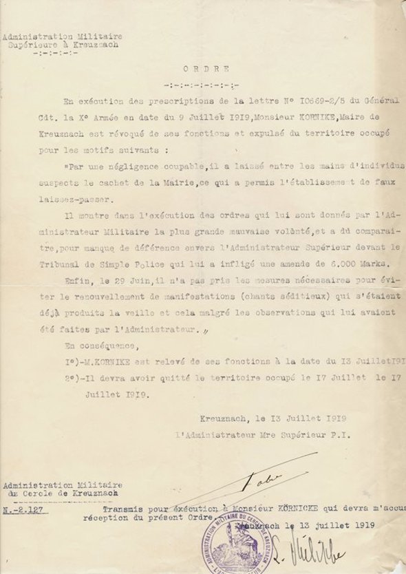 Das vorliegende Schriftstück vom 13. Juli 1919 befindet sich im Teilnachlass des ehemaligen Kreuznacher Bürgermeisters Dr. Hans Koernicke (1875-1956), der im Stadtarchiv Bad Kreuznach aufbewahrt wird. Es bezieht sich auf einen Brief mit der Nr. IO6 69-2/5 des kommandierenden Generals der 10. Armee vom 9. Juli 1919. Darin steht, dass Bürgermeister „Kornike“ mit dem 13. Juli 1919 seiner Funktionen enthoben ist und mit dem 17. Juli das besetzte Gebiet verlassen muss.