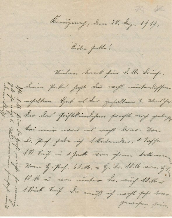 „Kreuznach, den 28. Dez. 1919. Liebe Jette! Vielen Dank für D. lb. Brief. Dein Paket hast Du wohl unterdessen erhalten. Hat es Dir gefallen? Was hat Dir das Christkindchen sonst noch gebracht? Bei mir war es recht brav. Von Fr. Prof. habe ich 1 Kalender, 1 Tasse, 1 St. Seif u 1 Jacke von ihren bekommen. Vom H. Prof. 60 M. v. H. Dr. 10 M vom H L. 10 M von unser Doktor 10 M u 1 Stück Seif. Da muß ich wohl sehr brav gewesen sein. Das hätte ich in C. nicht bekommen. Fr. Prof. habe ich ein Alpenveilchen geschenkt. Da sagte heute morgen der H. Dr. so hätte ich mich doch nicht in Unkosten stürzen dürfen, die wären doch so teuer, 1 kl. mit 1 Blume kostet schon 5 M. Ich sagte ihm wenn ich jemand was schenke solls ordentlich oder gar nicht sein.